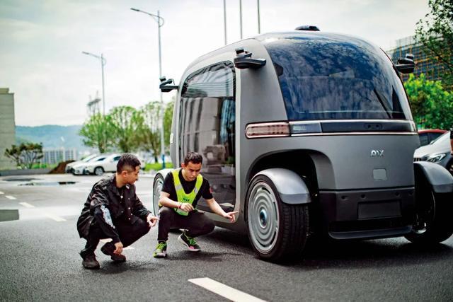2023年6月14日,在贵阳市高新区生态科技产业园一家无人驾驶汽车企业内,就读于新加坡国立大学机器人专业的实习生李昂民荃(左)和同事张军文一起调试车辆 图/新华