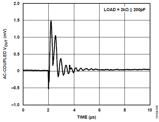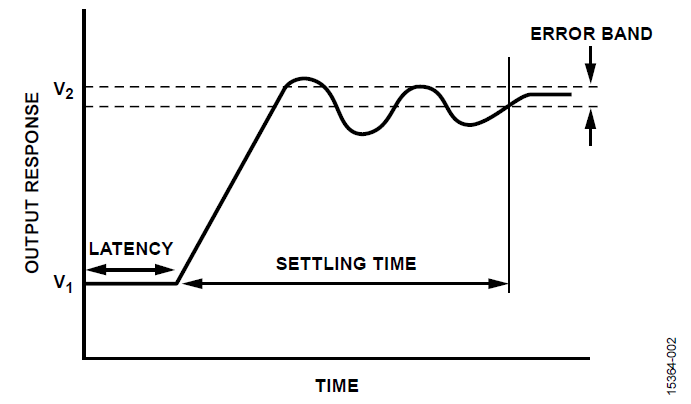 对于大步进的码跃迁,压摆率是建立时间的主要影响因素。此外,建立时间还可能因为输出负载的虚部而增加,这与电容或电感类似,产生过冲或响铃振荡。
