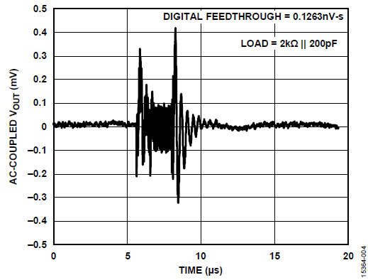 数字馈通是一个典型规格,因为传输到负载的能量取决于多个因素,例如数字输入电平、压摆率、信号发生变化的的数字走线数目(传输的数据)。